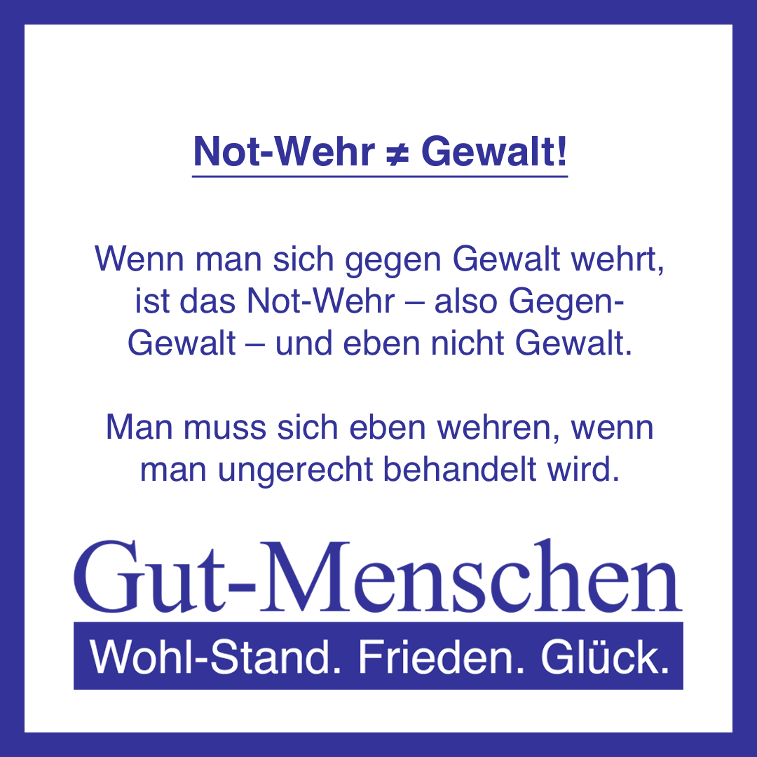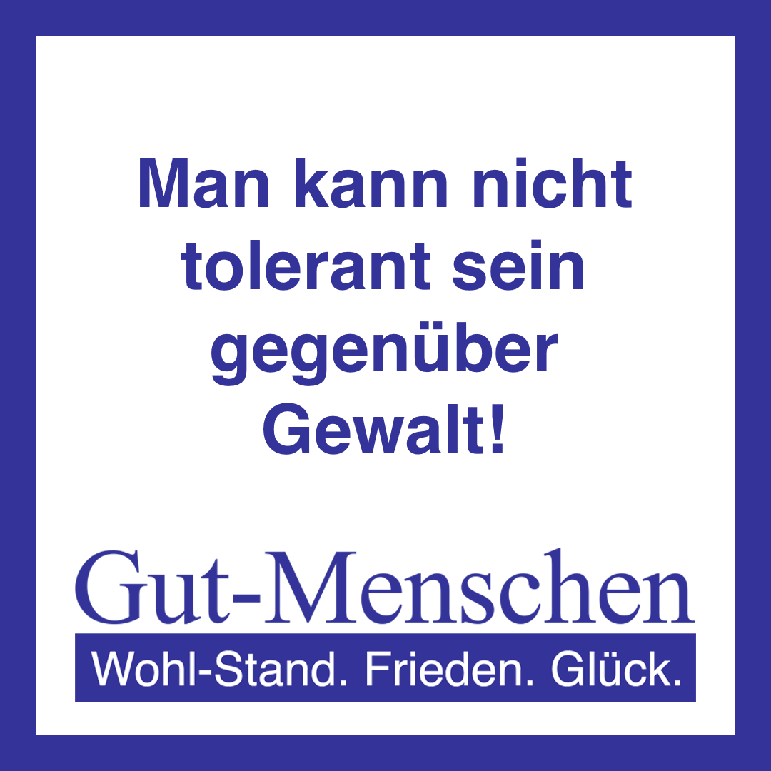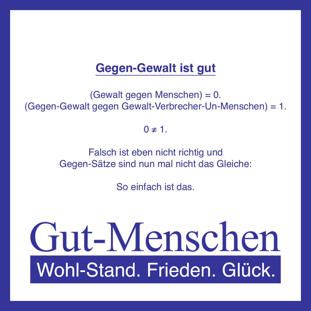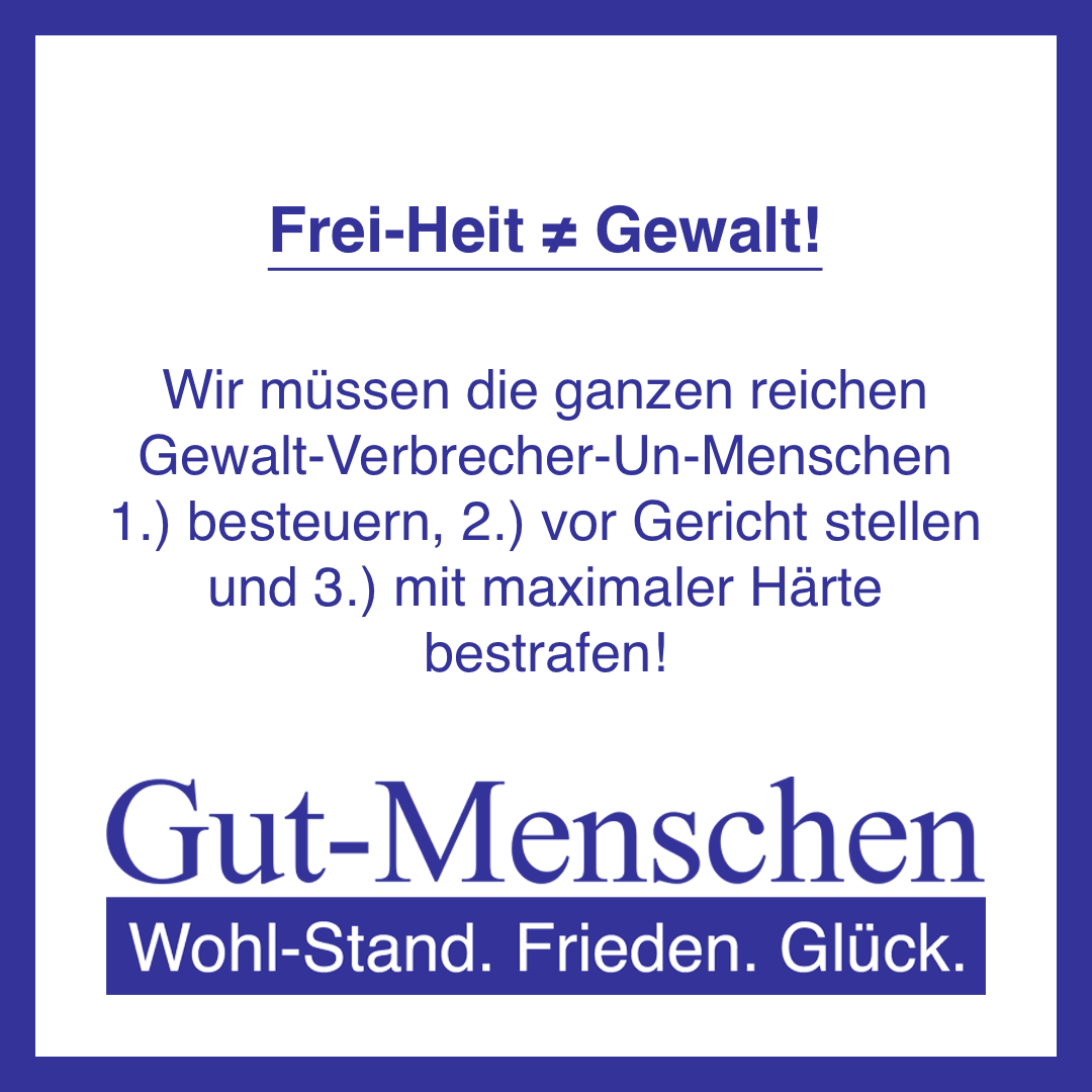 Die Gut-Menschen-Partei ist ausdrücklich gegen Gewalt gegen (Gut-)Menschen (10-100) und setzt sich ausdrücklich explizit nur für Gegen-Gewalts-Maßnahmen gegen Gewalt-Verbrecher-Un-Menschen (0) ein – so wie es auch der generelle Ansatz jeglicher Straf-Verfolgung im Zuge eines demo-kratisch-volks-herr-schaftlichen Rechts-Staates sein sollte.