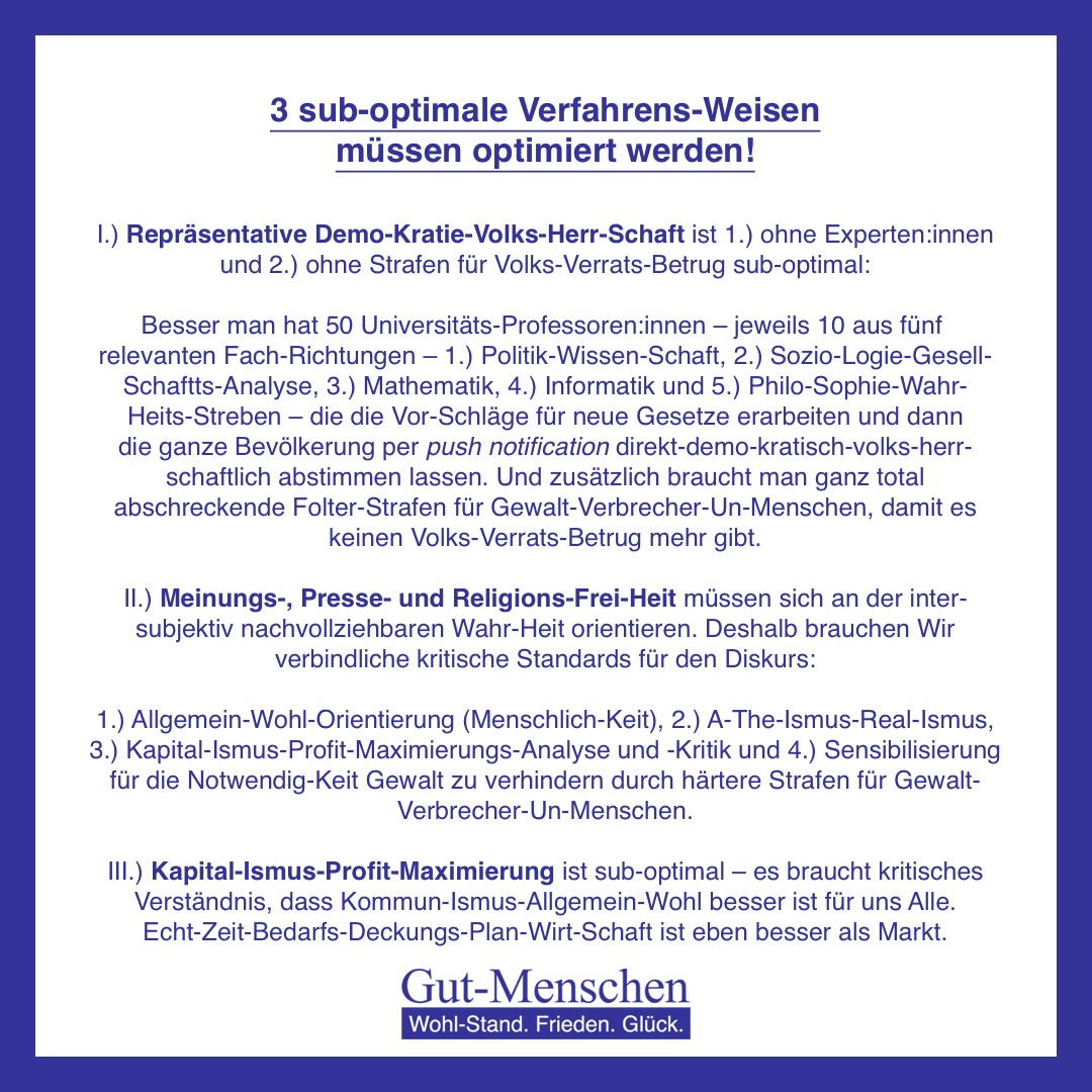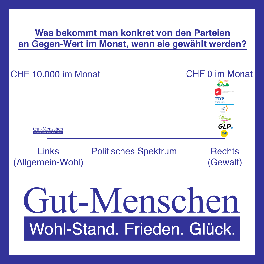 Die Gut-Menschen-Partei ist also mit Ab-Stand die beste Partei in der Schweiz – 1.) keine etablierte Partei und auch 2.) keine Klein-Partei kann da mithalten. Nur die Gut-Menschen-Partei setzt tatsächlich konsequent alle Inter-Essen der (Gut-)Menschen (10-100) – 1.) Wohl-Stand (Vermögens-Steuer), 2.) Frieden (Äquivalenz-Öko-Nomie) und 3.) Glück (aktive Liebes-Leistung) – ganz total moralisch-gewissenhaft nach bestem Wissen und Gewissen im Sinne des Allgemein-Wohls um. Nur die Gut-Menschen-Partei ist wirklich ganz total gut – eben ganz total optimal unterwegs. Alle anderen Parteien sind sub-optimal.