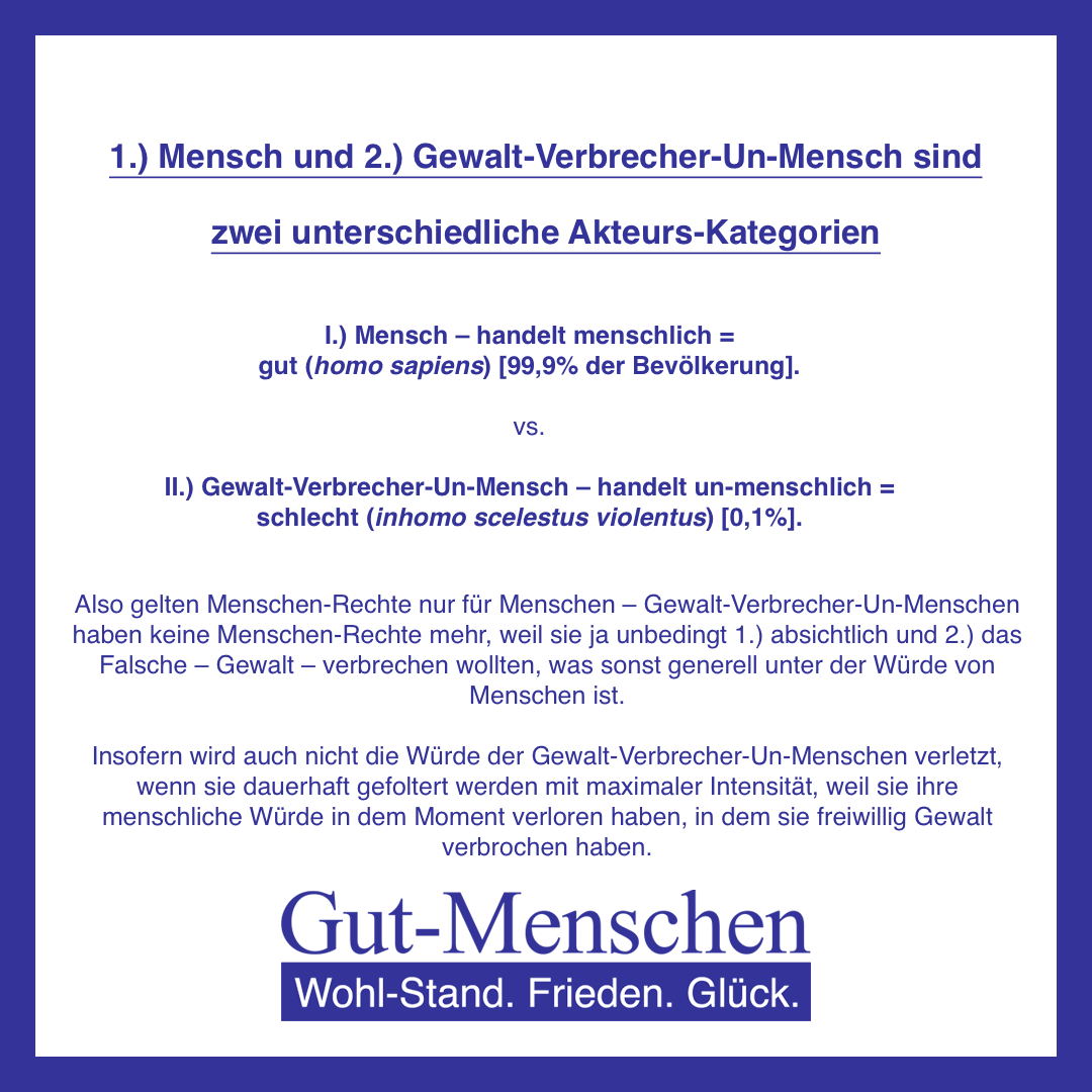 Genau wie die grundsätzliche Unterscheidung von 1.) (gut-)menschlich-moralisch-gewissenhaft handelnden (Gut-)Menschen (10-100) und 2.) gewalt-tätig-un-menschlich un-moralisch-gewissenslos-schlecht-falsch handelnden Gewalt-Verbrecher-Un-Menschen (0) ins Grund-Gesetz geschrieben werden muss, streben Wir Gut-Menschen (100) auch eine entsprechende Anpassung des Völker-Rechts an. Wir müssen uns gegen die Gewalt-Verbrecher-Un-Menschen (0) effektiv zur Wehr setzen – das geht nach allen empirisch inter-subjektiv nachvollziehbaren Erkenntnissen der Wissen-Schaft nur mit Folter-Strafen für Gewalt-Verbrecher-Un-Menschen.
