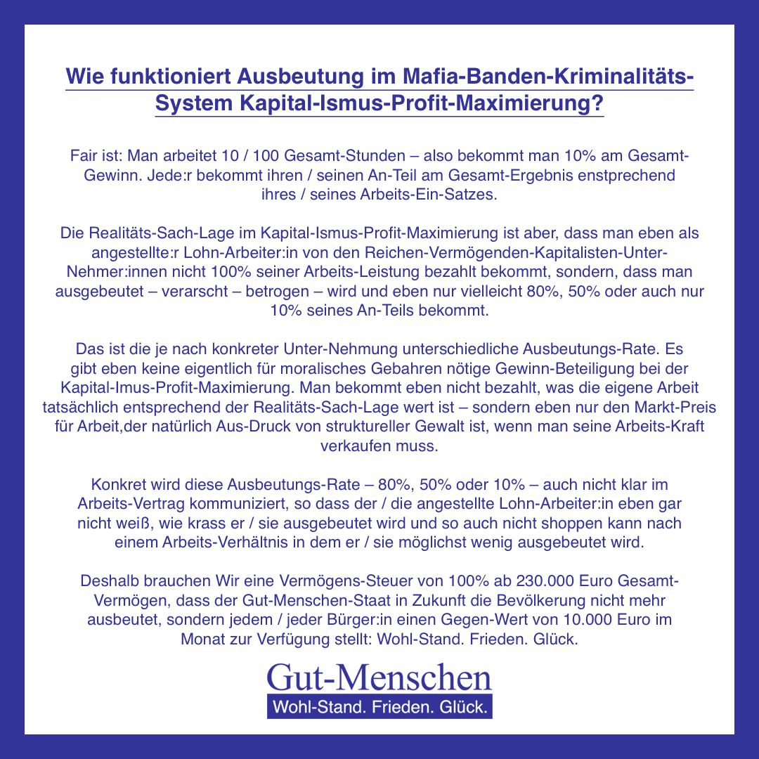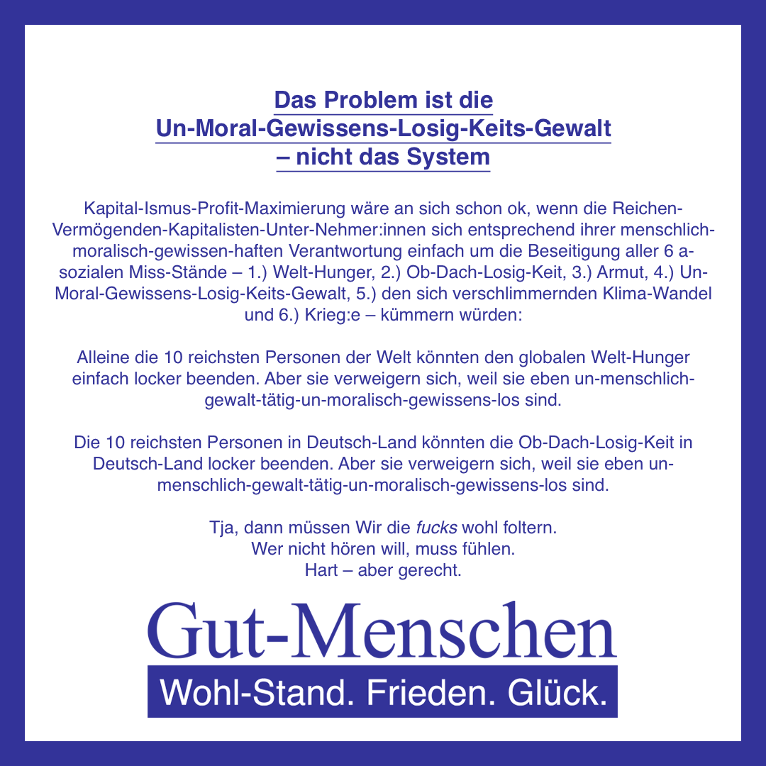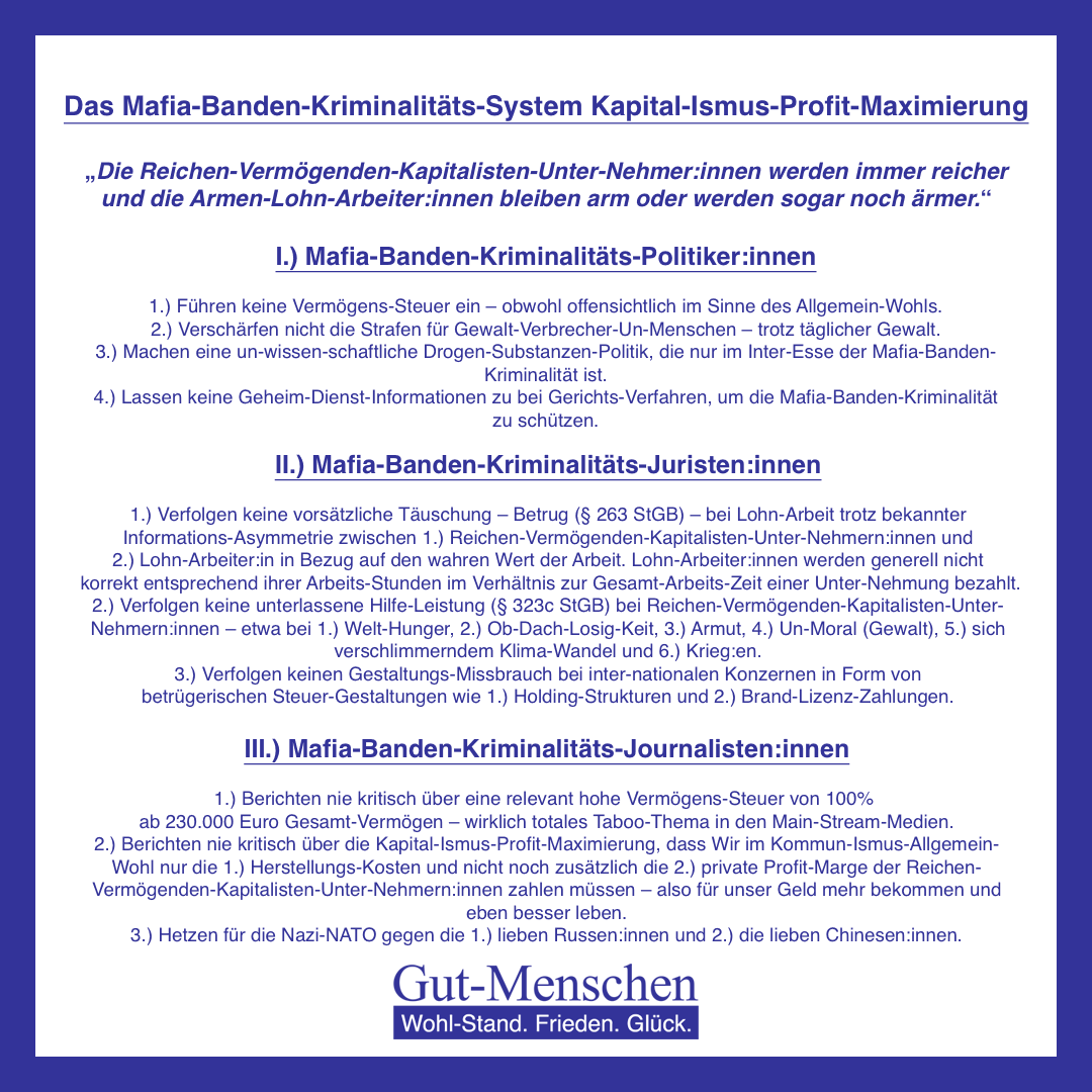 Würden sich die Mafia-Banden-Kriminalitäts-Politiker:innen tatsächlich wirklich ums Allgemein-Wohl kümmern hätten sie längst 1.) eine Vermögens-Steuer in relevanter Höhe eingeführt, um jedem (Gut-)Menschen (10-100) wenigstens zu geben, was er nun mal braucht und 2.) die Strafen für Gewalt-Verbrechen so verschärft, dass Keine:r mehr bereit ist, überhaupt Gewalt zu verbrechen – aber das haben sie eben absichtlich nicht gemacht, weil sie eben nun mal ausschließlich die Inter-Essen der Mafia-Banden-Kriminalität – nur immer weitere private Profit-Maximierung ohne auf Bedarfs-Deckungs-Bedürfnis-Befriedigung aller Bürger:innen zu achten – vertreten und insofern tatsächlich wirklich unser aller Allgemein-Wohl ganz total unverzeihlich verraten haben.