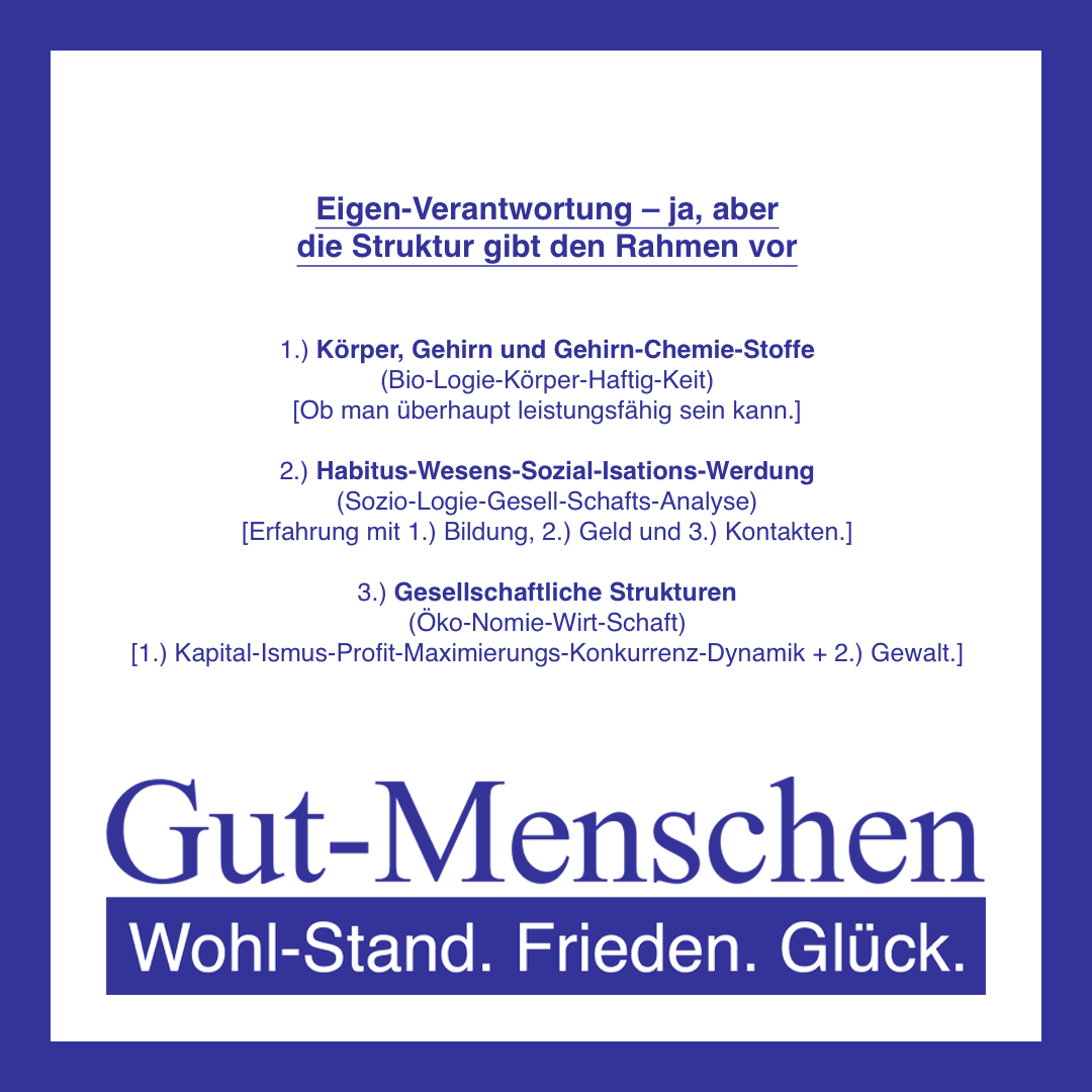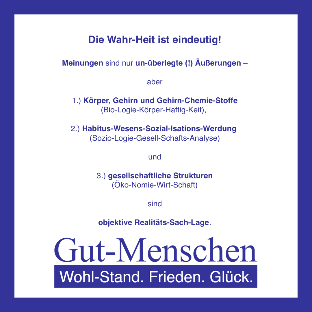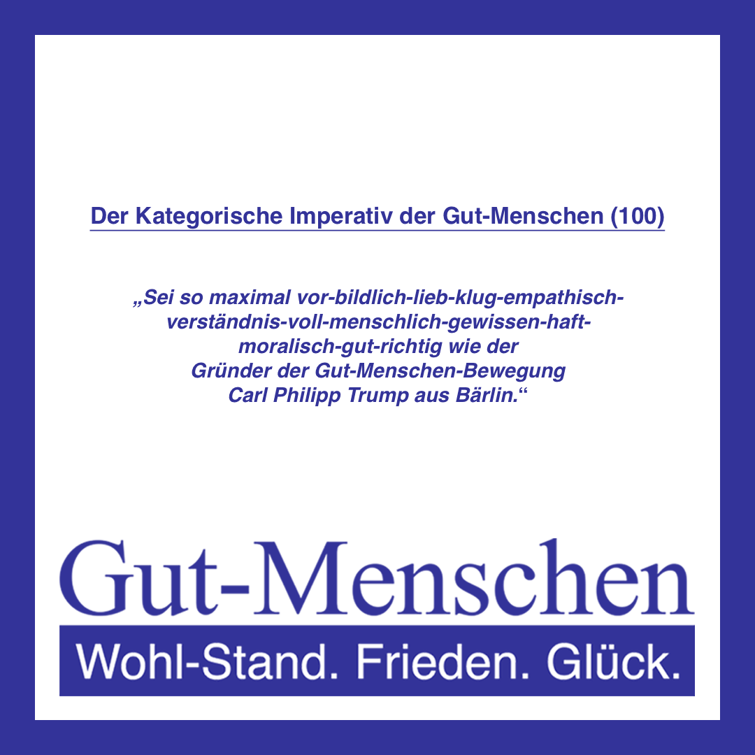 Insofern wünsche Ich Ihnen jetzt wirklich ganz viel Spaß beim inter-essierten Ein-Tauchen in das ganz total inter-subjektiv nachvollziehbar sinnvolle Gut-Menschen-Konzept – ganz im Sinne von 1.) Wohl-Stand, 2.) Frieden und 3.) Glück für alle (Gut-)Menschen (10-100)!