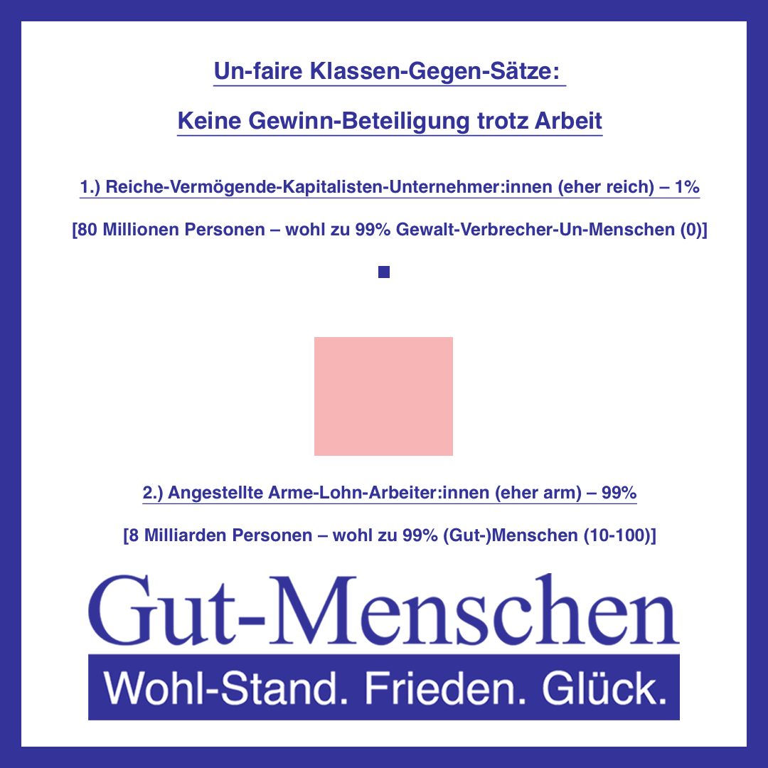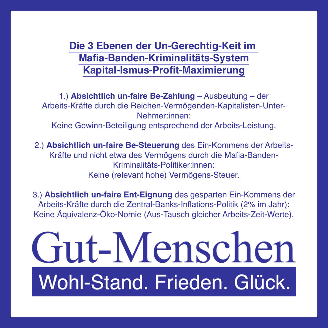 Unsere Politiker:innen sind keine normalen moralisch-gewissenhaften Politiker:innen, die sich ganz total moralisch-gewissenhaft nach bestem Wissen und Gewissen um das Allgemein-Wohl kümmern – sie kümmern sich ganz empirisch sozio-logisch-gesell-schafts-analytisch gesehen tatsächlich wirklich einfach mal gar nicht ums Allgemein-Wohl – es sind un-moralisch-gewissenslos-schlecht-falsche Mafia-Banden-Kriminalitäts-Politiker:innen, die uns alle verraten haben bei der täglich wieder stattfindenden realen Verschwörungs-Praxis der un-moralisch-gewissenslos-schlecht-falschen Reichen-Vermögenden-Kapitalisten-Unternehmer:innen gegen uns Alle im Mafia-Banden-Kriminalitäts-System Kapital-Ismus-Profit-Maximierung, weil sie mit voller Ab-Sicht 1.) die Reichen-Vermögenden-Kapitalisten-Unternehmer:innen immer noch reicher machen und die angestellten Armen-Lohn-Arbeiter:innen arm lassen oder sogar noch ärmer machen, weil sie keine relevant hohe Vermögens-Steuer eingeführt haben und 2.) zulassen, dass es jeden Tag (!) Gewalt – 1.) körperliche Gewalt – 1.) Mord, 2.) schwere Körper-Verletzung, 3.) Vergewaltigung und 4.) Dieb-Stahl / Raub / Betrug – und 2.) eben auch strukturelle Gewalt – 1.) Ausbeutung der angestellten Armen-Lohn-Arbeiter:innen und 2.) generell Miss-Achtung des Allgemein-Wohls – in der Schweiz gibt.