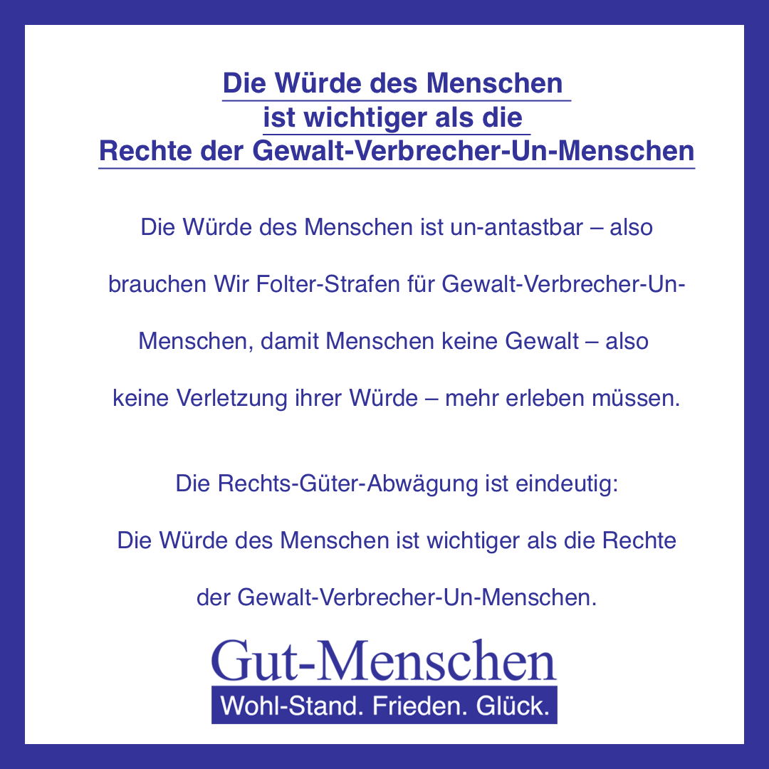 So sind Wir Gut-Menschen (100) in der Lage alle Gewalt-Verbrecher-Un-Menschen (0) dingfest zu machen, effektiv zu bestrafen und durch die abschreckende Wirkung der Folter-Strafen eine Gesell-Schaft ohne jegliche Gewalt Realität werden zu lassen, um so die Würde des (Gut-)Menschen (10-100) effektiv zu schützen und das Grund-Gesetz endlich auch in der konkreten Rechts-Praxis zu leben.