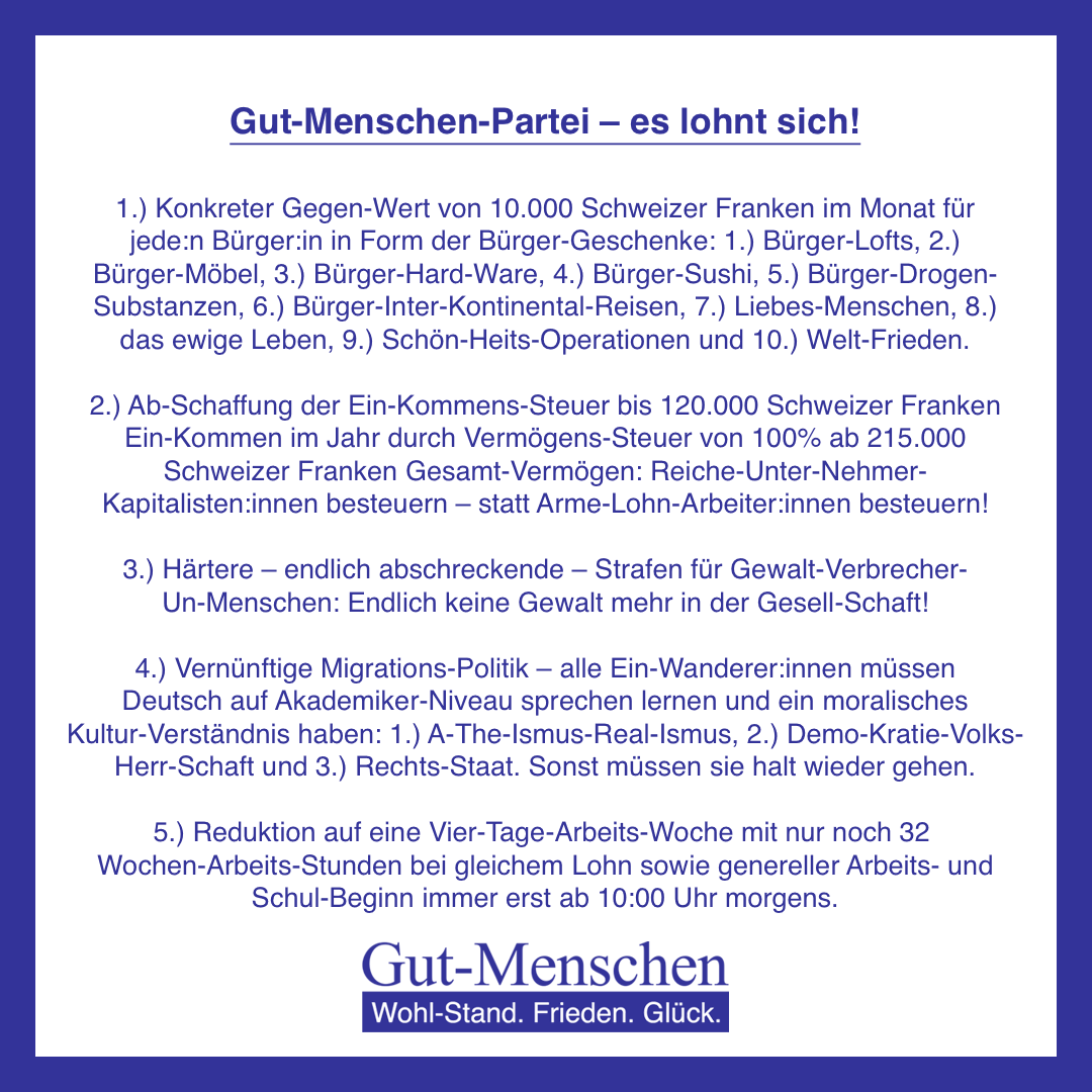 willkommen bei der Gut-Menschen-Partei in der Schweiz – im Folgenden möchten Wir Sie ganz total inter-subjektiv nachvollziehbar davon überzeugen, dass die Gut-Menschen-Partei die beste politische Partei in der Schweiz ist – nur sie bietet 1.) Wohl-Stand, 2.) Frieden und 3.) Glück für alle (Gut-)Menschen (10-100).