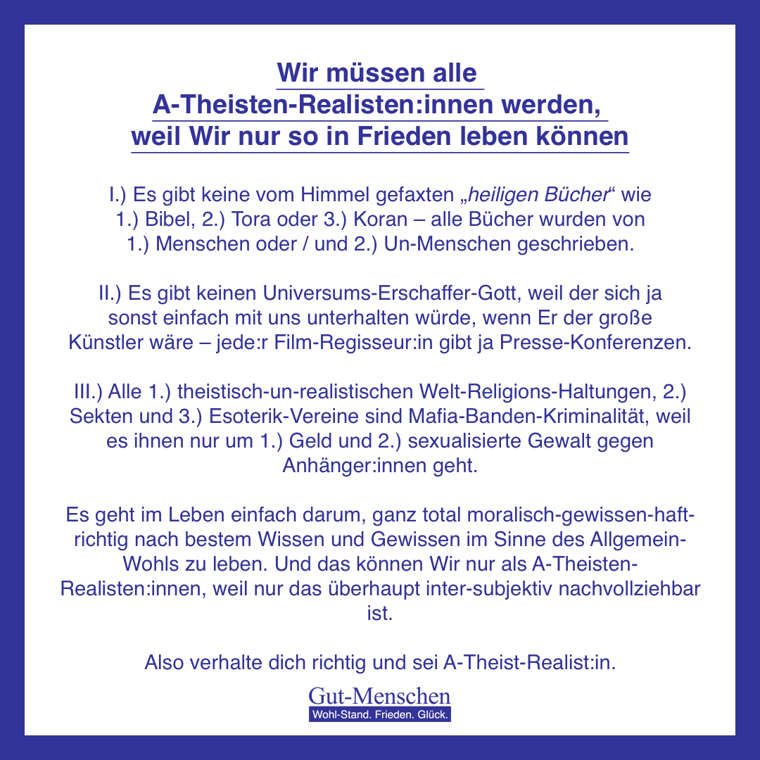 Als Gut-Menschen (100) sind Wir selbstverständlich A-Theisten-Realisten:innen und streben danach die Gelder von theistisch-un-realistisch Religions-Haltungs-Gemein-Schaften endlich an die Bevölkerung auszuschütten. Insofern enteignen Wir theistisch-un-realistische Religions-Haltungs-Gemein-Schaften und beenden jahrhundertelange Unterdrückung von a-theistisch-realistischen Positionen und bestrafen mit aller Härte den schrecklichen sexuellen Missbrauch von Kindern.